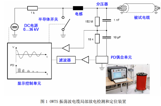電力電纜由于其電容量大,很難在現(xiàn)場進(jìn)行工頻電壓下的局部放電檢測。過去充油電纜采用直流試驗(yàn),可以大大降低電源的要求。但對XLPE電力電纜,由于其絕緣電阻較高,且交流和直流下電壓分布差別較大,直流耐壓試驗(yàn)后,在XLPE電纜中,特別是電纜缺陷處會(huì)殘留大量空間電荷,電纜投運(yùn)后,這些空間電荷常造成電纜的絕緣擊穿事故。采用超低頻(0.1Hz)電源進(jìn)行試驗(yàn),要求試驗(yàn)時(shí)間長,電纜絕緣損傷較大,可引發(fā)電纜中新的缺陷。振蕩波電壓是近年來國內(nèi)外研究較多的一種用于XLPE電力電纜局部放電檢測和定位的電源。該電源與交流電源等效性好,作用時(shí)間短、操作方便、易于攜帶,可有效檢測XLPE電力電纜中的各種缺陷,且試驗(yàn)不會(huì)對電纜造成傷害。OWTS振蕩波電纜局部放電檢測和定位裝置如圖1所示。檢測時(shí)可以靈活施加0-28kV的直流電壓,合上半導(dǎo)體開關(guān)后,被試電纜與電感產(chǎn)生阻尼振蕩。該裝置可以檢測的電力電纜電容范圍為0.05uF-2uF。