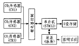前端傳感器輸出的數(shù)字信號(hào),以串口方式與STM32進(jìn)行通訊,此儀器設(shè)計(jì)三通道采集,利用繼電器電路對傳感器通道進(jìn)行選擇,STM32將濃度值顯示在液晶屏上,液晶屏帶有觸摸功能,通過編寫液晶顯示界面,調(diào)用相關(guān)按鍵程序,選擇傳感器通道以及保存為U盤數(shù)據(jù)等功能。框圖如圖1所示。